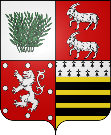 Écartelé : au 1, d’argent au buisson d’osier de sinople (Lauzières) ; au 2 de gueules à deux chèvres passantes d’argent posées l’une sur l’autre (Thémines) : au 3, de gueules au lion d’argent, à I’orle de 8 besans du même (Cardaillac) : au 4 d’or à trois fasces de sable et un chef d’hermine (de Penne). [1]