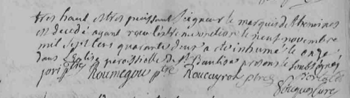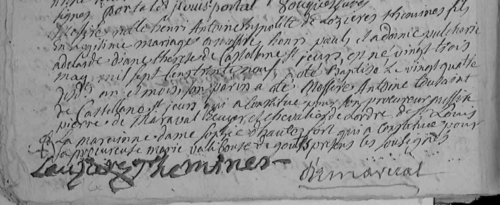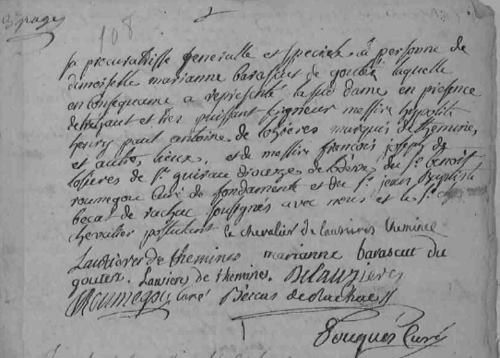 Marraine : Dame Sophie DHAUTEFORT, qui a constitué pour sa procureuse Marie Valibrouse de Goutes. [7]Henry Anthoine Hypolute de LOZIERES-THEMINES marquis de Thémines, brigadier des armées du Roy, mestre de camp, commandant du régiment de Beauce, chevalier de l’ordre royal et militaire de Saint-Louis, célibataire et sans postérité, décèdera à Paris le 25 février 1784, laissant ses biens à sa mère et à son frère.