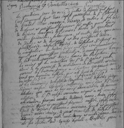 « Le quatrième jour du mois de juillet de l’année mil sept cent cinquante sept dans l’église paroissiale de St-Beaulize de Lirondel en Rouergue diocèse de Vabres le fils cadet de très haut et puissant seigneur défunt messire Paul-Henri de LAUZIERES marquis de THEMINES baron de Gourdon Milhac, Cardaillac, La Bouriane et autres lieux gouverneur de Dôme [9] et de très haute et très puissante dame Pulchérie, Adélaïde, Diane, Thérèse de CASTELLANE et JEURS, né à Montpellier le huitième février mil sept cent quarante trois, lequel par permission particulière de monseigneur l’évêque de ladite ville y avait reçu l’eau de baptême par les mains et le ministre du sieur St-BONET prêtre curé de la paroisse de Notre-Dame de ladite ville et vicaire général le huitième février mil sept cent quarante trois ainsi que lui-même l’atteste par acte signé de sa main en date du 26 avril mil sept cent cinquante sept et les cérémonies de l’église du baptême ayant été différées jusqu’à ce jour au sus dit chevalier de THEMINES.