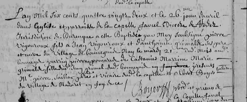 Boyer peut même utiliser les deux termes dans le même acte. Ainsi à l’occasion du baptême de Pierre Vigouroux qui semble de la ligné des Grimal de Bonneguide, le prêtre note ses père et mère du « village de Bonneguide » et précise que Pierre est né « le 21e au dit Bonneyde » [11]