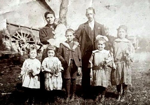 Lucie Galtier, Ernest Canac et leurs enfants vers 1925 (certainement : Solange dans les bras de Lucie et devant Madeleine, Odile, Louis, Thérèse et Marie)