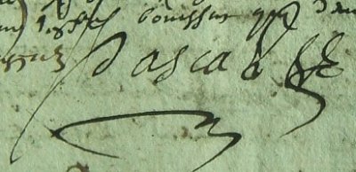– Jean PASCAL époux d’Hélix GUIRAUDON, de la Pascalerie, décédé avant 1648, mon Sosa 2056, dont le fils aîné s’appelle aussi Jean et sait signer