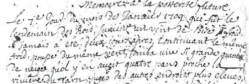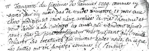 J’ai transposé du sixième de janvier 1709 comme cy après pour n’y avoir pas de vide à mettre et poser une chose prodigieuse pour n’être arrivée de vie d’homme et pour servir à la curiosité de ceux qui viendrons après nous, que je prie le Seigneur tout puissant qu’il veuille délivrer les créatures qui vivront après nous, en ce que les suites ont été funeste comme il s’ensuit