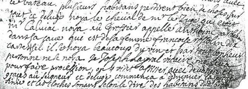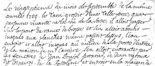 Le vingt septième du mois de septembre de la même année 1709 le Tarn grossit d’une telle force que personne vivante ne la vu de la sorte. Il allait passer sur le pont du Rance de Brosse et s’en allait aboutir jusques aux planches même passait dessus. L’eau entrait et allait jusqu’au milieu de la porte d’entrée de la maison de Mr CARRIERE, s’en allait entrante par les fenêtres de Jean POUJOL serrurier, de Jean VIGROUX dit los peiros de la Rossoline et entrait en la maison de la veuve de Philip LAVABRE, à peine se peut elle sortir avec sa petite famille, descendant par une échelle après être sorti par la fenêtre. Si fortement la rivière croissait ensemble avec le Rance, ce déluge surprit grandement tous les habitants. Cela arriva tout d’un coup sans en être menacés comme cela arrive d’ordinaire sur les 8 heures du soir et surtout cette impétuosité d’eau surprit les bateliers, car la grande barque s’en alla avec dix sept petits bateaux de Brousse où du barry que les habitants perdirent. Le couvert avec la muraille du coté du château fut renversé avec tout le boisage qui était dedans comme mâché tremuegis, ……… les fourches ?, la caisse avec du blé. Les saumiès furent fait de nouveau pour être gâtés et pourrit, ce qui fit du bien au meunier car il se serait peut être perdu. Pour dire qu’un malheur est quelque fois bon le Seigneur du lieu le nommé Mr de GRANSSAIGNHES de Séverac le remis en la perfection dans un mois avec le bateau plusieurs habitants perdirent bien des choses. Surtout ce déluge noya le cheval de Mr le Juge qui était Mr CALVIAC, noya un greffier appelé Anthoine BARTHELEMY dans sa cave qui est de sa femme Françoise ROSSOLIN dit cartessel, il se noya beaucoup de vin et par tout bonheur personne ne se noya. Je Joseph LAYRAL vicaire me leva pour faire procession, on y vint assister avec dévotion et grâce au Seigneur. Ce déluge commença à diminuer la procession finie et les cloches sonnant selon les dires des habitants dud Brousse.