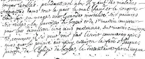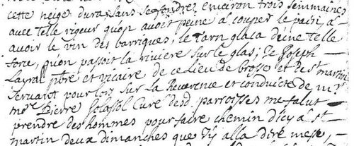 Le 7e jour du mois de janvier 1709 qui fut le lendemain des rois survint un vent de bise froid et jamais a été deux jours après, continuant le même froid poussé du même vent, tomba une si grande quantité de neige qu’il y en avait quatre pans proche la rivière du Tarn. Le pan faisant 25 centimètres, cela fait 1 mètre de neige. Jugés des autres endroits plus élevés cette neige dura sans se fondre environ trois semaines avec telle vigueur qu’on avait peine à couper le pain, à avoir le vin des barriques, le Tarn glaça d’une telle force, qu’on passait la rivière sur le glas. Je Joseph LAYRAL prêtre et vicaire de ce lieu de Brousse et de Saint Martin servant pour lors sur la révérence et conduite de Mr Mtre Pierre SOLASSOL curé desdites paroisses me fallut prendre des hommes pour faire chemin d’ici à Saint Martin deux dimanches que j’y allai dire messe, je n’eus, grâce au Seigneur des malades à visiter pendant ce temps. Cette rigueur d’hiver causa la perte presque totale des fruits de la terre. Il n’y eût pas la moitié des grains des autres années ; point de vin quoique les vignes reboutent sur la fin de mai. Les pruniers, cerisiers domestiques, figuiers, amandiers ne portèrent pas, comme aussi les noyers qui moururent tous avec la plus grande partie des châtaigniers. On vendit le blé 22 livres le sac, la pipe de vin 80 livres. Il n’y avait rien à bon compte que la "chaix". L’huile de noix et d’olive la livre, au mois de juillet et d’août on ne trouvait du blé avec l’argent à la main. On ne sortait pendant ce temps chaque province gardait le sien, quoique on abolit cet Edit après un mois à cause qu’il y avait des provinces plus pauvres que d’autres, qui n’en trouvait pas, la cherté du blé dura jusqu’au milieu de juillet (1710 ??) à cause du temps qui n’était propre pour couper les blés pendant un an. Il y eut des maladies fréquentes dans tous le pays. Le mal chaud et le pourpre sont forts en usage. Une grande mortalité soit pauvres que riches, la paroisse de Brosse et de Saint Martin composée pour lors d’environ cinq cents personne, sont mortes environ 50 comme il se peut voir par l’écrit commencé cy après quoique le pourpre eût fini environ la fête Saint Jacques patron de l’église de Brosse, le (dissentaire) fût en vogue.