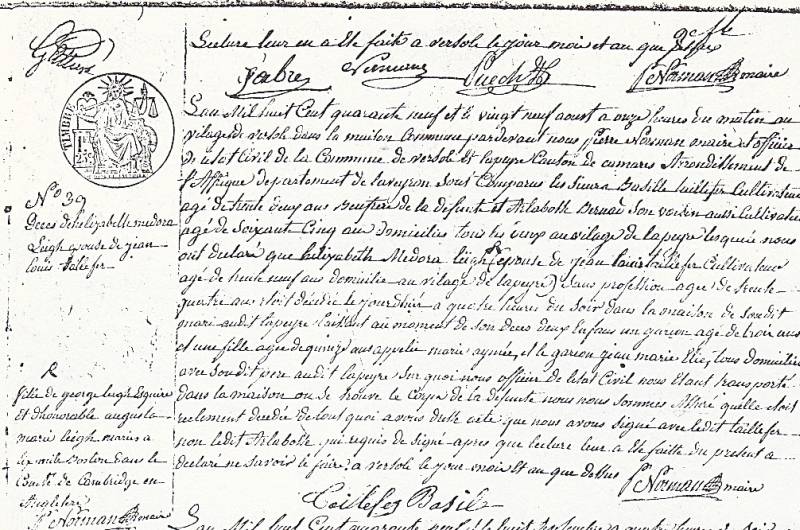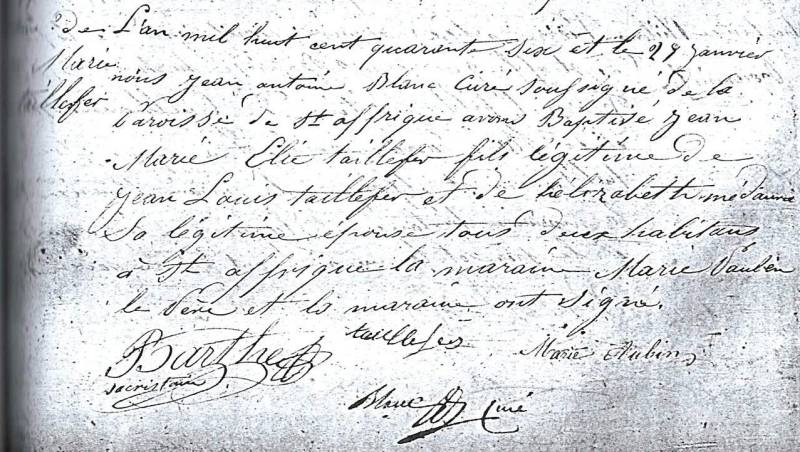 Le 27 Janvier 1847, Medora mit au monde un garçon ; Jean Louis TAILLEFER déclara l’enfant le 28 Janvier à Saint Affrique, et Jean Marie Elie TAILLEFER fut baptisé ce même jour. La marraine est Marie AUBIN…la fille de Medora qui approche de sa 13ème année.