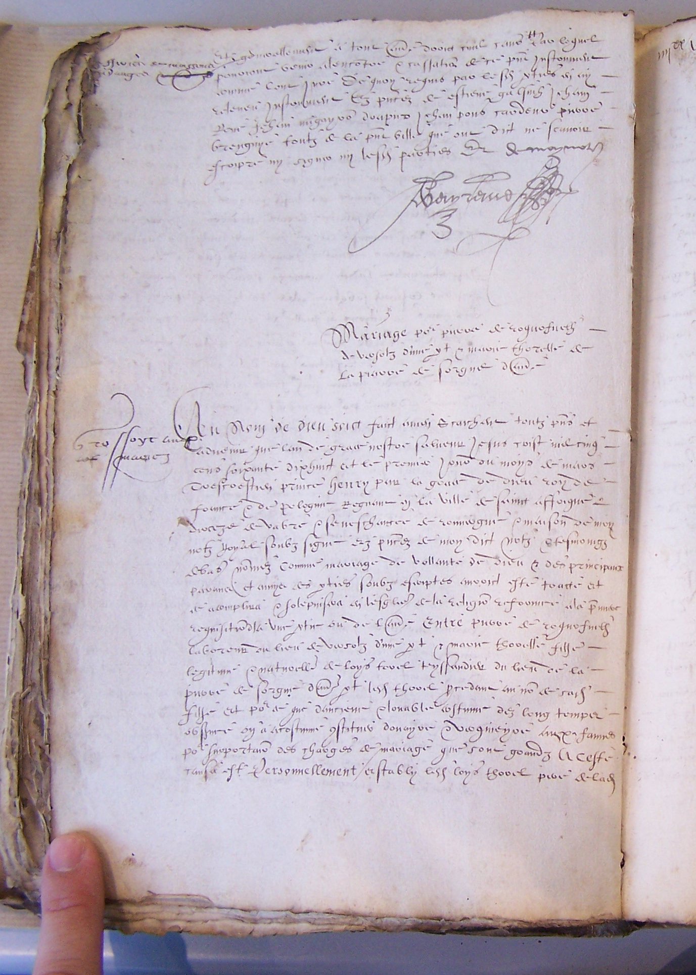 Au nom de dieu soict faict amen scaichent toutz présents et advenir que lan de grace nostre salveur Jesus Crist mil cinq cens soixante dix huict et le premier jour du moys de mars très crestien prince Henry par la grace de dieu roy de France et de polognie régnant en la ville de Sainct Affrique et diocèze de Vabre et seneschaussée de Rouergue et maison de moy notaire royal soubz signé en présences de moy dict notaire et tesmoingz debas nommez comme mariage de vollanté de Dieu et des principaux parans et amycs des parties soubz escriptes auroict esté tracté et se acomplira et solepnisera en lesglise de la religion réformée à la première requisition de la une partie ou de l’autre entre Pierre de ROQUEFUELH laboreur du lieu de Versolz d’une part et Marie THORELLE filhe légitime et naturelle de Loys TOREL teyssandier du lieu de la Pierre de Sorgue d’autre part. Ledit THOREL procédant au nom de sadite filhe et pour ce que danciene et louable costume des long temps observée on a acostumé constituer douayre et verquieyre aux fames pour suportation des charges de mariage que sont grandz. A ceste cause est personnellemnt estably ledit Loys THOREL père de ladite