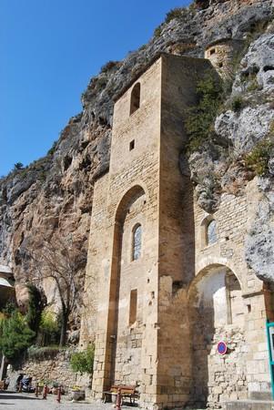 Peyre était le siège d’un Prieuré qui n’était pas sans importance. Le presbytère actuel, ancienne demeure du Prieur, est une construction considérable établie sur de vastes caves. L’ancienne église, située tout à côté, est fort curieuse. Placée dans une excavation du rocher, qui forme dans toute sa rusticité la paroi de gauche et la voûte, elle est fermée du côté droit par un mur d’un bel appareil, flanqué d’un clocher adossé au roc. On y remarque des travaux de défense, meurtrières et bretèches. Les inscriptions qui surmontent la porte et la fontaine nous apprennent que ces constructions furent élevées en 1594 et 1609 par le prieur Boscari. Un écusson chargé d’un animal fantastique, moitié licorne moitié chèvre, est reproduit deux fois dans la construction et devait être le sceau de la communauté.